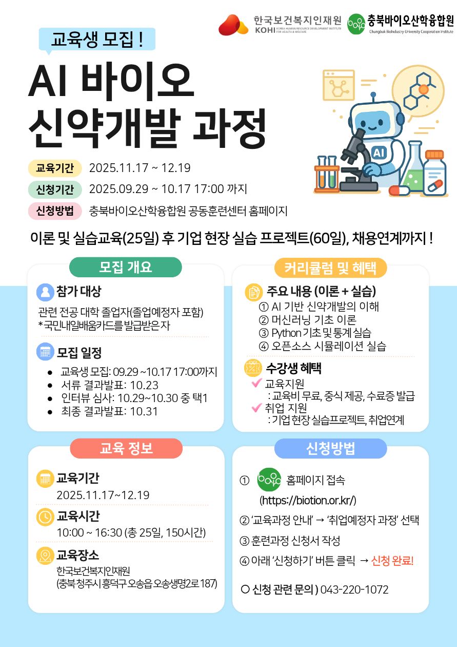 [교육안내 ]충북바이오산학융합원 AI바이오 신약개발 과정 | |
